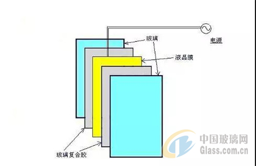 首先,我们需要知道,调光玻璃是一种将液晶膜固化在两片玻璃之间,经过特殊工艺胶合后一体成型的夹胶结构的新型特种光电玻璃产品,它的结构是“玻璃—胶片—调光膜—胶片—玻璃”(如下图)。