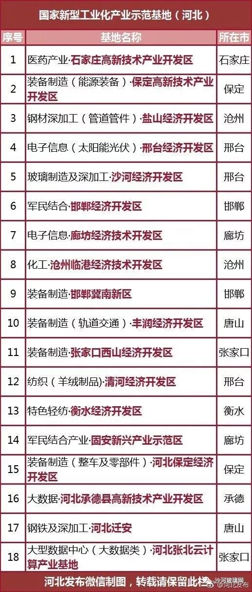 日前,国家工信部印发通知, 公布第八批国家新型工业化产业示范基地名单,河北共有18地获评这一国家级示范基地称号,未来通过部门协调和部省联动,将加大政策扶持、集中资源大力支持其发展和建设