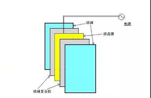 首先,我们需要知道,调光玻璃是一种将液晶膜固化在两片玻璃之间,经过特殊工艺胶合后一体成型的夹胶结构的新型特种光电玻璃产品,它的结构是“玻璃—胶片—调光膜—胶片—玻璃”(如下图)。