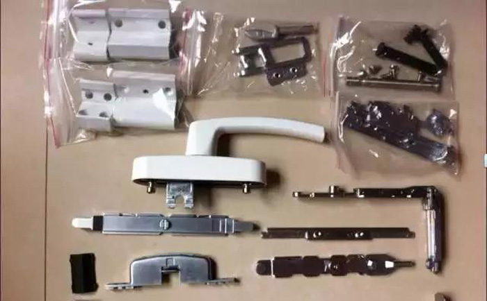 您如果是客户,您希望您家的铝合金门窗是以上那种材料做出来的吗? 02五金件不一样 不同品牌的五金件其价格可谓是天壤之别,下面两款内开内倒配件,它们的价格相差两倍之多,它们颜色一样,功能一样,但一款是知名厂家的产品,已经在市场上销售了很多年,有了比较高的知名度,另一款是小作坊生产仿品,它们外表虽然一样,但是它们材质完全不同,生产工艺不同,表面处理不同,所以它们的使用寿命及安全性能完全不在一个档次上。