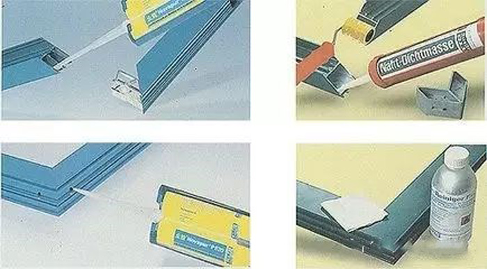 就是相同的材料,在不同的生产厂家,制作工艺也是有着巨大差距的,一些小的门窗厂家在组装门窗时,他们仅仅限于把门窗组装起来,只要牢固就可以了。而正规大厂在组装门窗时,除了牢固美观以外,在组装时,先要在铝材的截面涂抹组角胶,组角完成后,要对组角内部进行注胶,用组角胶将角码与型材之间的缝隙填充起来,使得他们之间成为一个整体,即连接得更牢固,又能防止组角部位漏雨,同时在气密性上又上一个台阶。如下图: