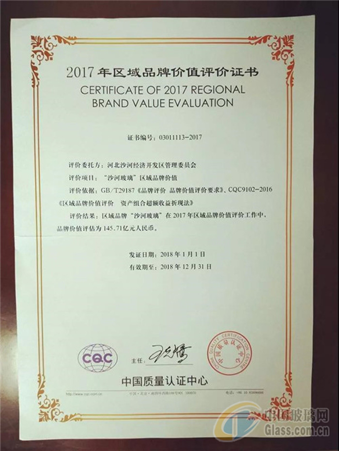 近日,中国质量认证中心发布2017年度区域品牌价值评价结果,在2017年区域品牌价值评价工作中,我市申报的“沙河玻璃”项目区域品牌价值被评估为145.71亿元。较2016年度的88.28亿元增长57.43亿元,增长率65%,“沙河玻璃”区域品牌价值实质提升。