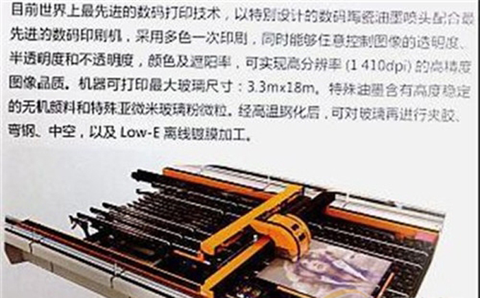 目前世界上先进的数码打印技术,以特别的设计数码陶瓷油墨喷头配合先进的数码打印机,采用多色一次印刷,同时能够任意控制图案的透明度、半透明度和不透明度、颜色及遮阳率,可实现高分辨率(1410p)的高精度图片品质。机器可打印的玻璃尺寸:3.3m x 18m。特殊油墨含有高度稳定的无机颜料和特殊亚微米玻璃微粒,经高温钢化后可对玻璃在进行夹胶、弯钢、中空以及low-E离线镀膜加工。