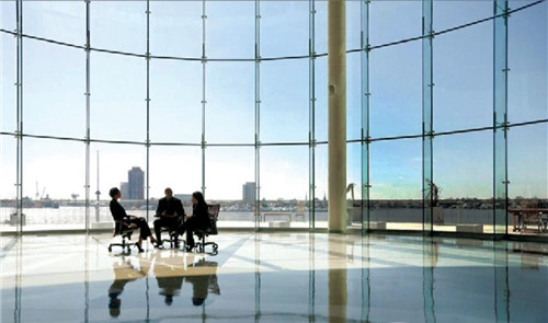 温致变色玻璃在满足传统夹层玻璃的安全防爆、隔音、保暖的优良性能外,还可以根据光照和温度自主调节颜色,在浅色和深色状态可逆转变,遮阳系数动态可变,同时保持可透视性,将采光和遮阳完美融合。它是一款专为建筑设计的“变色眼镜”,增加了建筑玻璃本身的遮阳功能,节省遮阳材料的使用。更重要的是它还能够感知外界温度的变化为建筑自主更换外衣,增强隔热保温双向性能,赋予传统建筑更加低碳,更加智能的特性。