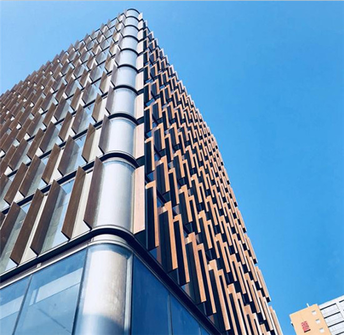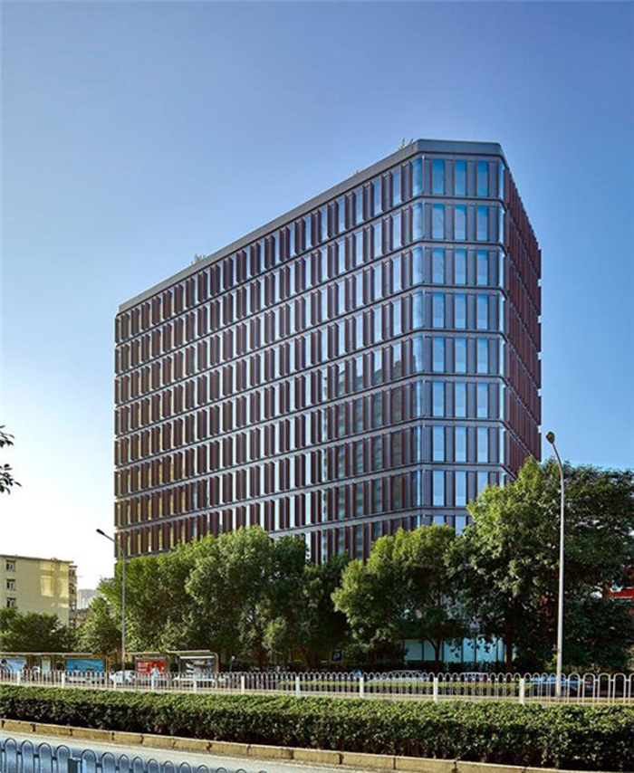 三才堂写字楼的玻璃幕墙采用弧形转角的玻璃和温暖的木纹百叶轻柔的介入周边环境,玻璃幕墙中的每一页板材外都会木纹百叶作为衬托,一方面可以增加建筑物立体感与层次感,立面上的木纹百叶和入口出挑深远的木格珊屋檐,在保持建筑内部良好通透性的同时,消除了建筑对周边住宅的光污染,塑造积极健康的城市环境。更重要的是,木纹百叶的温和与亲切,带给人回归自然的放松,给都市人以心灵的慰藉。