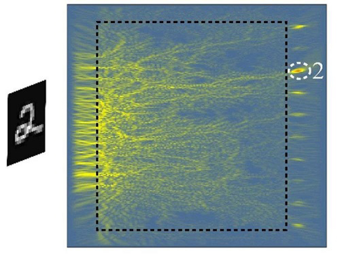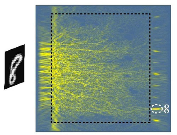 玻璃中巧妙放置的微小气泡和杂质会以特定方式弯曲光线,以区别于不同的图像。这就是人工智能的作用。为了证明其概念,工程师们设计了一种方法来制造识别手写数字的玻璃碎片。从数字图像中发出的光从玻璃的一端进入,然后聚焦到玻璃另一端的九个特定点中的一个,每个点对应一个数字,当手写的3变成8时,这种玻璃的动态足以实时检测到。实验室研究生Erfan Khoram感叹到:研究能够用如此简单的结构得到如此复杂的行为,这真的很了不起。