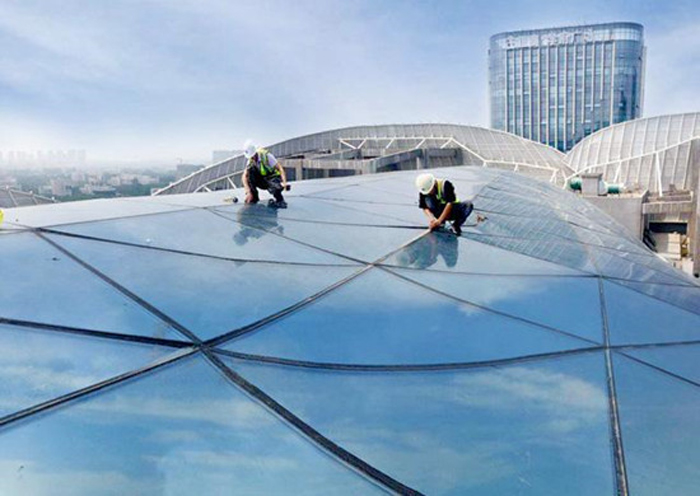 完美呈现 “采光顶是一个花生的形状,共17拼,跨度20多米,玻璃下料首次采用了激光逆向扫描成像技术,再与BIM相结合,确保了不同规格尺寸的玻璃下料精准。”宋永波说。 因为采光顶在60多米高的部位,为了确保安全,避免焊渣之类的掉下去伤及现场施工人员,项目部把钢骨架的吊装和焊接安排在晚上10点钟以后,这时,人们一般都下班了,下边也没有行人通过。在四周照明灯亮如白昼的光线下,一个经过白天养精蓄锐的施工班组,夜里上班,集中作业,用连续15天的夜间施工,采光顶的骨架安装顺利完成。接着,他们对每一块经过精心计算提料的异型玻璃,也一一吊装,一次性安装合格率达到95.92%。 项目部经过对加工制作,现场安装每道工序的严格控制,解决了众多技术难题,优质高效地完成了施工任务,并顺利通过竣工验收,其《提高异形玻璃面层安装一次验收合格率》获得河南省工程建设QC成果二等奖,受到业主和专家的一致好评。 目前,该项目已接受过10余个业主单位的参观考察,为企业今后承接更多的类似项目提供了强有力的支撑。 如今,造型别致、层次分明的融创文化大厦,以四面流畅顺滑的水波形双曲面轮廓,加上垂直向上的铝合金方管和轻盈百变的玻璃幕墙,仿佛一朵晶莹剔透的莲花矗立在龙子湖畔,艺术与自然和谐统一,展现出美轮美奂的装饰效果。