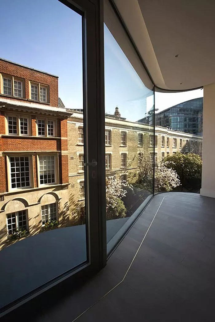 在处理跨越两条不同特征街道的复杂场地时,DROO设计了一种建筑回应,以确保连续性,同时引入了一个独特的设计。 场地的特殊之处是位于两种不同的城市形态之间,西侧是传统的伦敦联排别墅,东侧是壮丽的维多利亚式豪宅。 此外,法规监管的历史沉淀,传承积累,形成了一个精细调谐和极其复杂的体量。公寓的核心建筑与家庭式地体量的联排别墅合并。 通过凸形的雕刻体量和凹面玻璃,解决了高层公寓和联排别墅之间的二分法。同时回应当地的限制并提供新的空间类型学,外立面“剥离”成新颖的弓形窗。