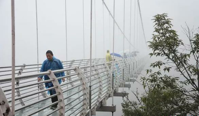 据悉,从观景步道通往玻璃天桥的木梯已经搭建完毕,悬在两个山头之间的天桥正翘首以待游客到来。当日上午,九峰山景区秋雨绵绵,云雾缭绕的悬崖峭壁时隐时现,平添了几分神秘与诗意。距离景区西门800余个台阶、处于半山腰的玻璃天桥,在绵绵秋雨和云雾的衬托下,更显得高耸险峻。记者在工作人员的引导下,走近施工完毕的玻璃天桥,由于云雾的遮掩,全长218米的玻璃天桥大部分隐匿在风雨中。站在天桥的中央往下看,深不可测,不时晃动的天桥让人产生一种强烈的失重感和眩晕感。