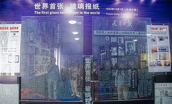 它是当今世界首张较大的玻璃报纸,复刻的是1949年10月1日的‘天津日报’,反映当年开国大典的盛况,为庆祝建国55周年而作。按原版6倍放大,由两块高2.2米,宽2.6米的“版面”组成,重125公斤,原版的印刷体楷体、行书及领袖像全部采用陶瓷艺术点击镂刻技巧,结合玻雕技艺刻成,已申报上海世界基尼斯纪录。