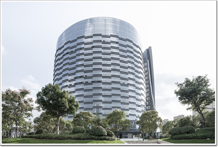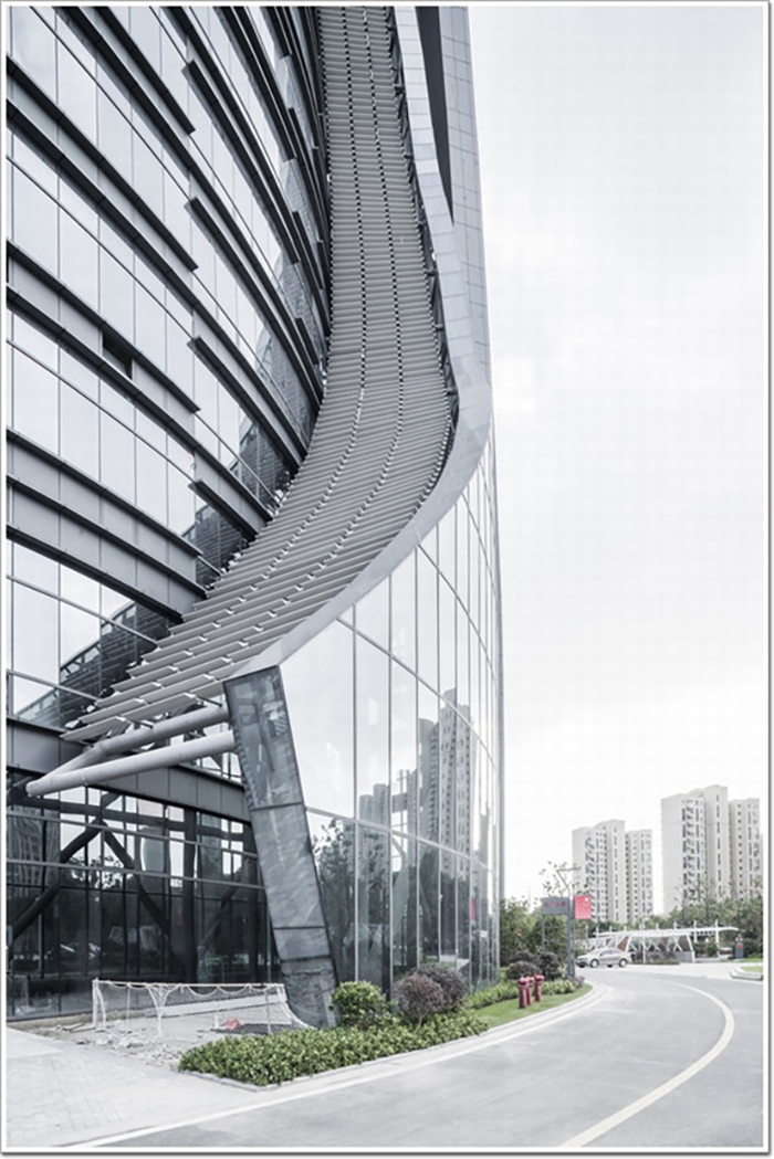 在外立面方面,椭圆形的造型简洁干练,两侧入口前厅的书卷形中庭空间层层收进对椭圆形体进行完美的切割雕琢,外幕墙以金属装饰板和玻璃幕墙为设计元素,幕墙面积约32000平方米,造价约3000万元。外皮通过金属装饰板和玻璃幕墙的对比做到虚实结合,外挑横向金属装饰板有序的错落变化更好地凸显出主体建筑横向脉络的肌理,其灵动的质感和流畅的现代感,俯瞰之下,就像一只充满智慧的眼睛。