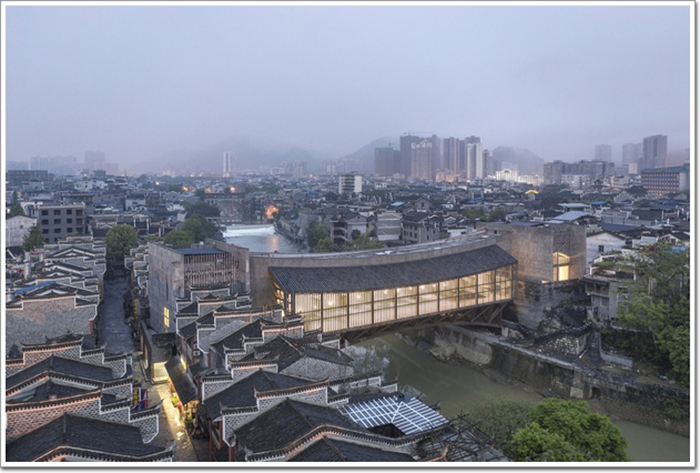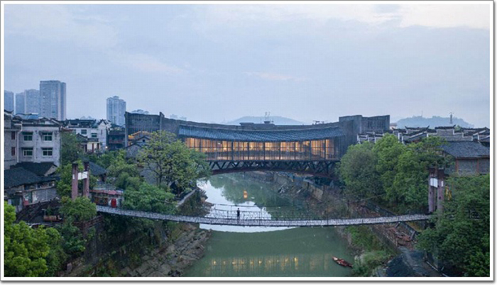 吉首市是湘西土家族苗族自治州的州府,在该市的乾州古城万溶江上,兴建了一座特别的建筑物——吉首美术馆,项目由艺术大师黄永玉出资捐建,是一座艺术与设计兼具的廊桥建筑物。