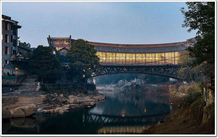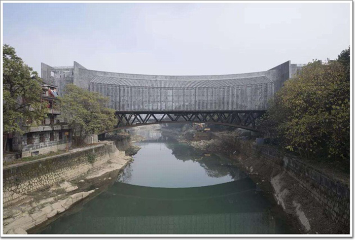 被称作风雨桥的廊桥在我国山区里有着悠久的历史。除了跨越河流或山谷的功能,它们也是供旅人休憩、商贩摆摊售卖的公共空间。作为对这一古老建筑类型的当代诠释,美术馆设计在保持传统廊桥的交通与歇脚功能的同时引入新的艺术内容,并将风雨桥的形式语言加以现代化,而吉首美术馆的建成,算是对这一带居名的文化艺术熏陶了。