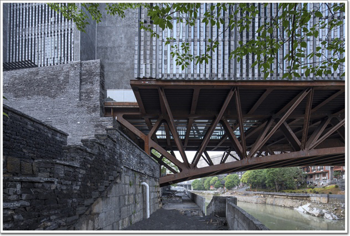 两岸的桥头部分与万溶江畔的排屋紧密相连在一起。这些排屋包含了店铺、餐馆、小旅馆,楼上通常便是屋主的居所。因此,吉首美术馆位于河两岸的入口都可以被视作混合功能街道界面的一部分,从而实现真实的融入。