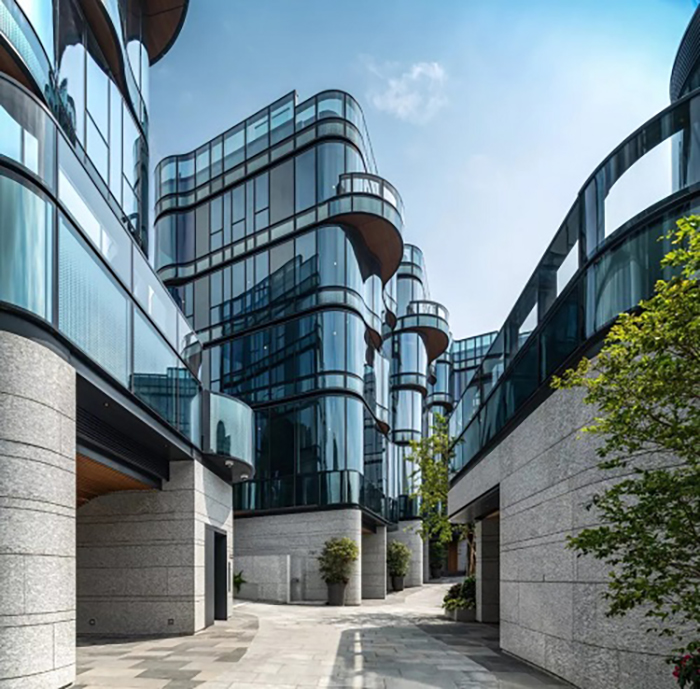 每一幢、每一层都是独特的线条,彼此区别,又相互联系。从周边走过,不同的角度会看到建筑不同的样子,像较了瞬息万变的海。建筑外立面的材料也精心挑选了玻璃幕墙,当阳光在起伏的曲线玻璃上衍射,便把周边的风景倒映在上面,一步一换,建筑的表面上总是自然风景。