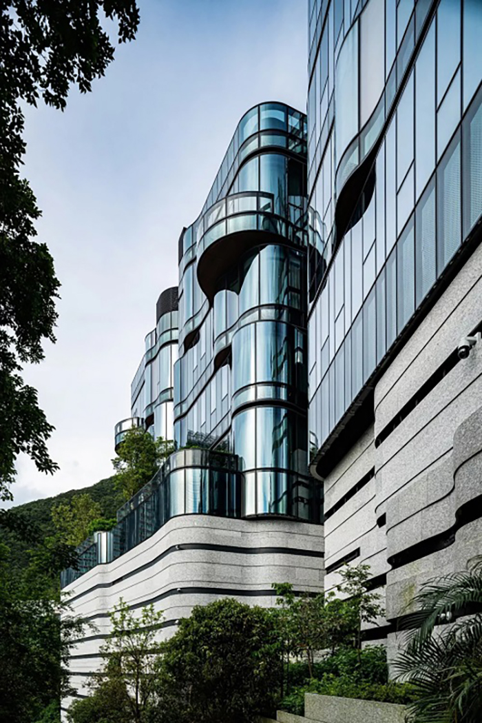地块周边满是枝繁叶茂的大树,郁郁葱葱,自然气息浓重。设计没有选择硬冷的四方形体量,而是就地取形,以浅水湾常见的海浪为蓝本,借用它富有律动、变化万千的线条勾勒建筑轮廓,让建筑变得生动、富有自然气息。