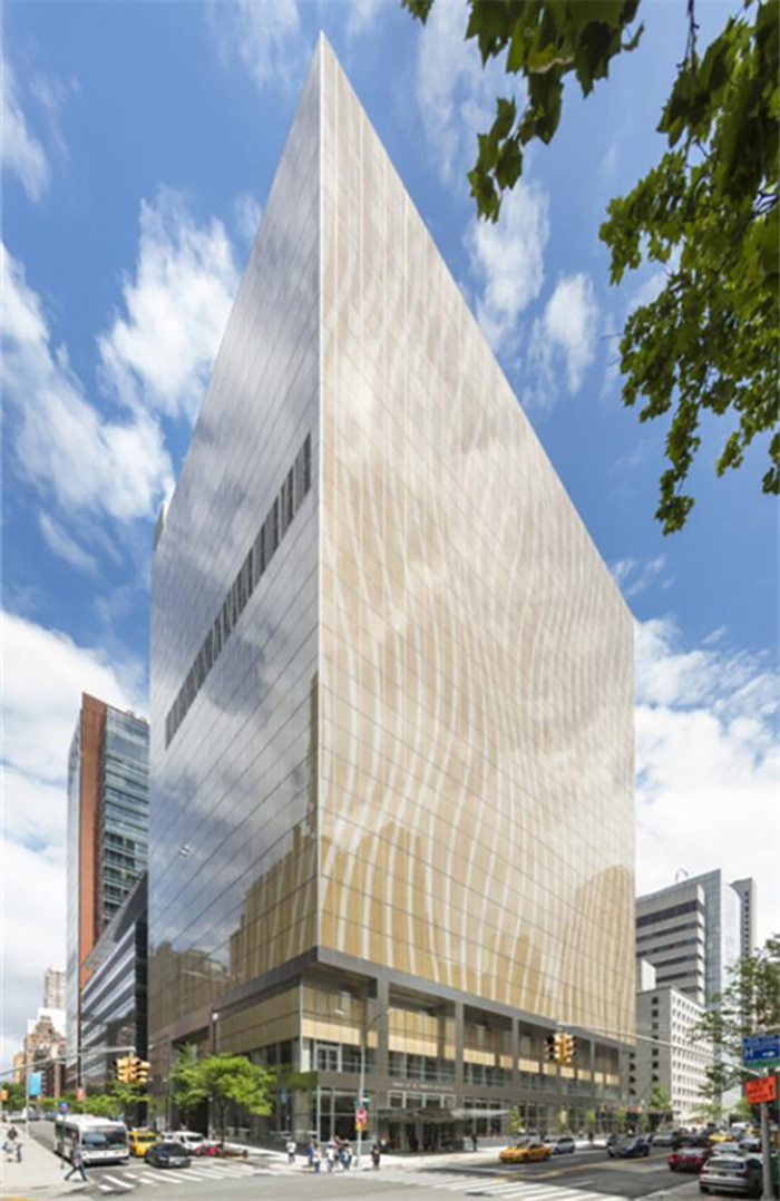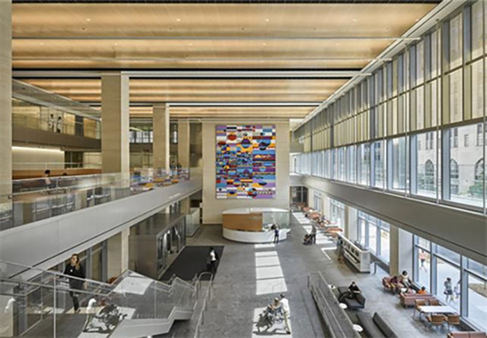医院的幕墙主要是以玻璃幕墙为主的,使整座建筑犹如一座大的透明玻璃体量。建筑整体设计和功能的前沿是以患者和家属为中心的护理,幕墙设计师采用玻璃作为幕墙的主要材质,可以让医院内的病人及家属减少压抑感,人们可以透过玻璃幕墙可以享有到充足的日光和生动的艺术品营造出宁静的氛围。无论是步行穿过约克大道还是乘坐汽车,亲切的大厅都会为周围拥挤的街道和人行道提供休息之处,营造一个相对放松的环境,病人在这类的环境下,紧张的心情也能够适当地得到缓解。