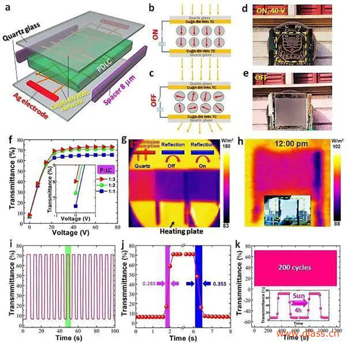 更有趣的,该透明电极具有可见光和红外光的选择透过性,基于Cu@h-BN纳米线网络和液晶技术,作者成功地制备了一种新型智能调光玻璃,它可以控制玻璃能见度由透明到不透明的快速切换(0.26s);同时,利用Cu@h-BN纳米线有效阻挡中红外光,可屏蔽辐射热,达到节能的目的,在军事等领域还可实现防止红外监控的功能,有望成为未来智能建筑的黑科技组件之一。