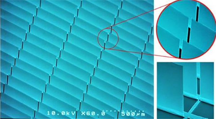 垂直站立的平面微镜阵列的SEM显微照片,带有放大的插图。图片来源:Hillmer等。