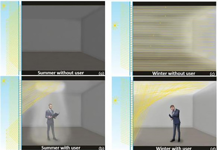 (a)如果在夏天没有人在场,则所有后视镜均会垂直切换,从而将太阳光保持在外面。通过大程度地减少热传递,可以节省大量能源。(b)在夏季,一旦传感器检测到用户存在,则后视镜将打开并将日光反射到天花板区域。在没有用户站立的地方,房间保持凉爽,节省了气候的能源。房间的远离窗户的部分可以通过日光有效地照明,从而节省了人造光的能量。(c)如果冬天没有使用者,则所有的镜子都会打开,并通过将太阳辐射反射到墙壁上作为辐射加热器来收集能量。这节省了用于加热的能量。(d)一旦在冬天检测到用户存在,所有的镜子都会将整个太阳辐射重定向到天花板,以较大程度地减少眩光。现在,天花板充当辐射加热器,节省了加热能量。
