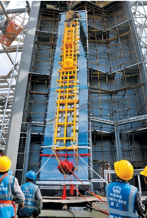 城市副中心图书馆使用的超大玻璃幕墙,无论从外形还是受力体系上,都属国内首 创,在国际上也无先例。超大玻璃幕墙运输到施工现场时,更要拆除围挡,确保入场安全。在正式安装前,项目部已多次展开论证,多次进行安全施工系数测试,以确保运输、存放准确安全。除了运输、存放难度大,安装玻璃的打胶过程需要在封闭场所中进行。因此,项目部定制了一个巨大的无尘箱体辅助施工。玻璃吊装就位后,工人将在箱体内给玻璃打胶。