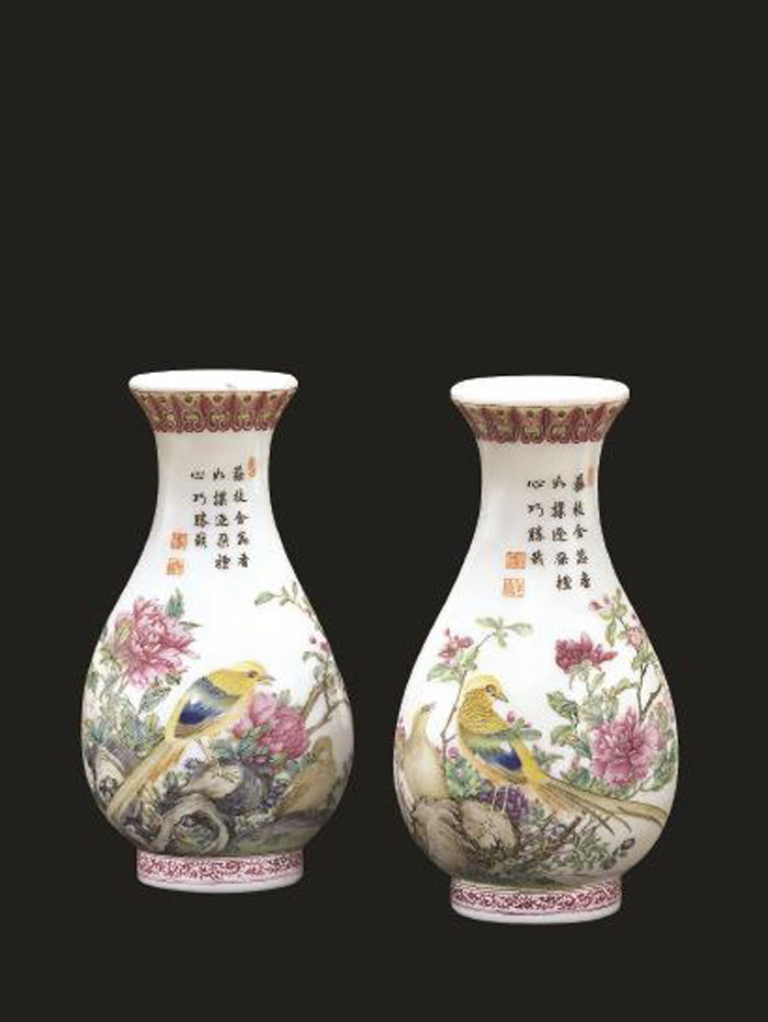 玻璃胎画珐琅花鸟纹诗书画印对瓶之一