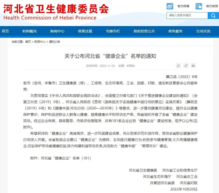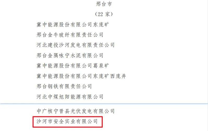 根据河北省卫生健康委等6部门《关于公布河北省“健康企业”名单的通知》,邢台沙河市安全实业有限公司被评为河北省“健康企业”。