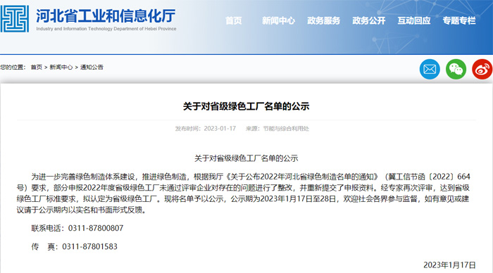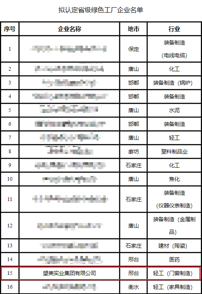 近日,河北省工业和信息化厅发布“关于对省级绿色工厂名单的公示”。其中,集团旗下望美分公司荣获上榜。
