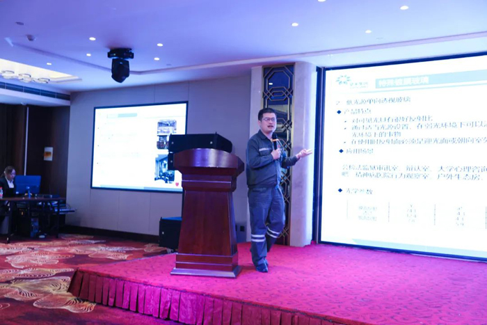 观看完镀膜产品宣传片后,望美公司执行总经理潘清涛为与会客户讲解了镀膜新品种类、性能和其优势,展示了不同种类、颜色的镀膜玻璃可以应用到不同的环境,可满足多种需求的人群,并对现场客户提出的疑问进行解答。