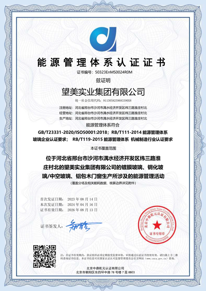 近期,望美集团旗下望美公司进行了镀膜车间、深加工车间能源管理体系的扩项审核认证及门窗车间能源管理体系年度审核认证工作,认证工作圆满完成并于4月下旬取得认证证书。