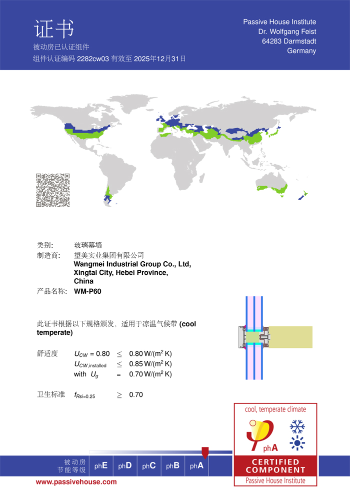日前,集团旗下望美公司通过提交认证申请、产品检验检测、产品资料技术参数计算评审、工厂审查等环节,已确定望美工厂的生产保证能力,并且产品能够符合被动式超低能耗的标准。最终望美铝包木幕墙产品WM-P60顺利通过德国PHI认证,门窗新产品WM-P120被动式铝包木窗、WMX90被动式铝合金窗荣获康居认证!