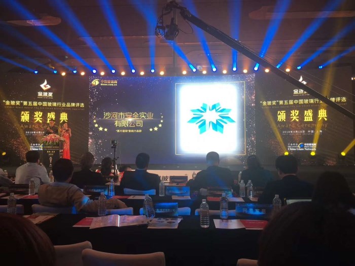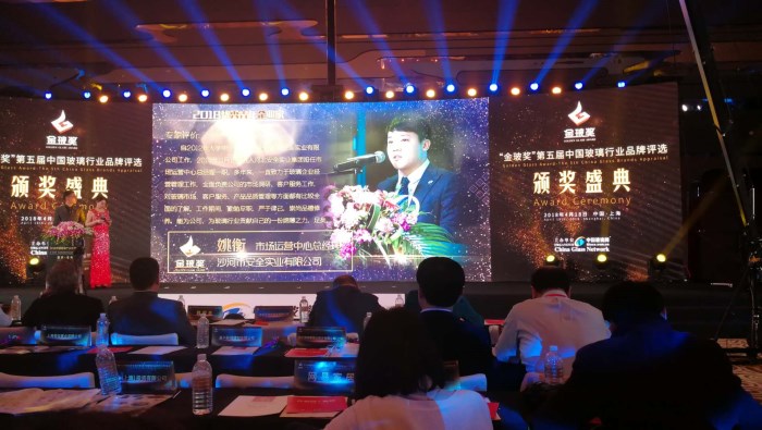 4月18日下午,由中国玻璃网主办的“金玻奖”第五届中国玻璃行业品牌评选结果揭晓。安全实业实力入围两大奖项,其中沙河市安全实业有限公司荣获2018“原片玻璃影响力品牌”,河北中玻公司总经理姚衡荣获“优秀青年企业家”称号。