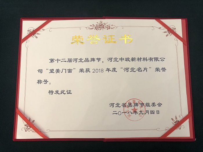 河北中玻新材料有限公司的“望美门窗”荣获2018年度“河北名片“荣誉称号。