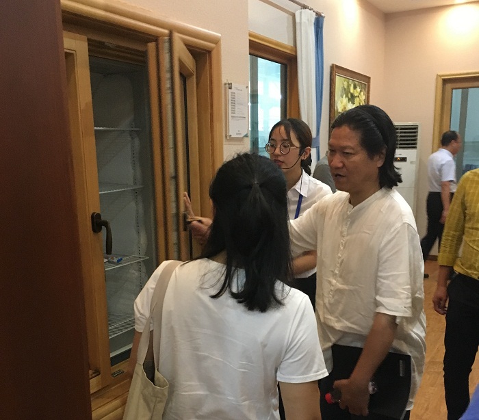 随后,参观团成员来到河北中玻,着重参观了望美门窗展厅,考察高端定制门窗产品的特性与工艺。讲解员在门窗展厅一边介绍望美门窗产品的节能环保理念,一边实地演示门窗产品特性。功能强大且样式美观的望美门窗产品给参观团留下了深刻的印象。素有“中国陶艺大师”之称的朱乐耕老师在看到应用于门窗的“异形玻璃”后,对其产生了浓厚的兴趣。