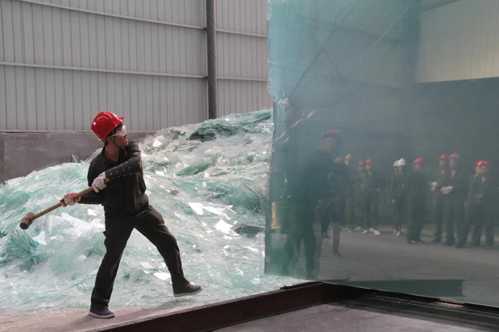 5月25日,安全望美生产部副总经理张利波率领沙河安全玻璃生产线、技术团队、安全环保部管理者一行三十余人,亲自抡锤砸掉了生产出来的不合格产品。