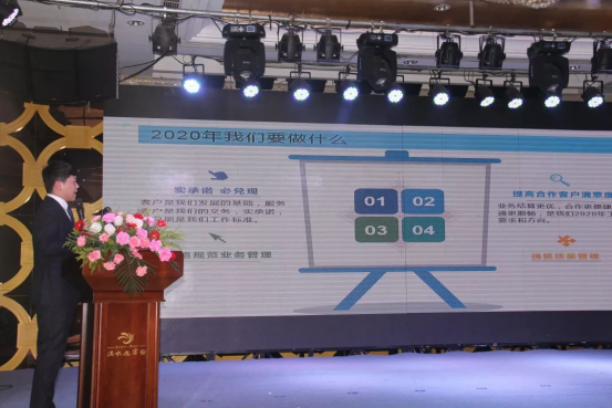 供应事业部总经理姚衡上台做发言致辞,姚总对集团2019年的供应工作进行了年终总结,并为与会人员讲解展示2020年度计划报告。