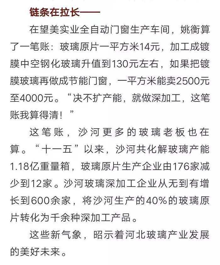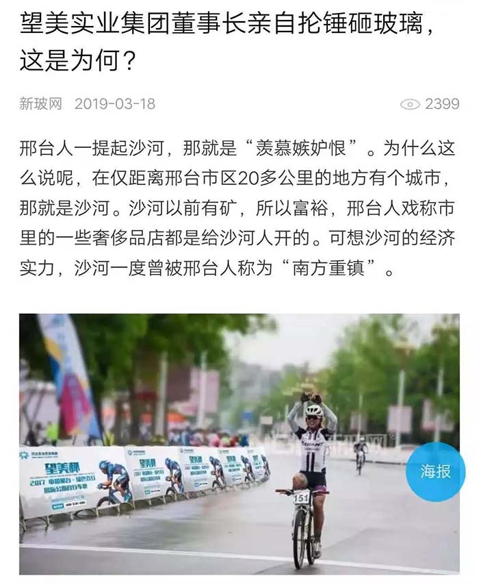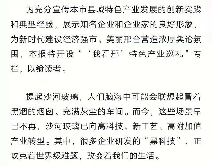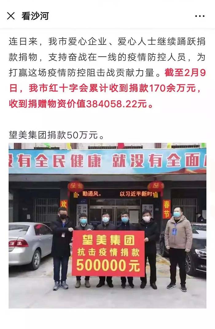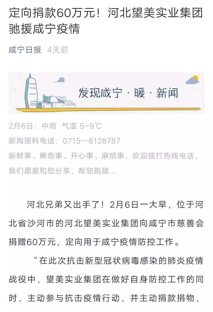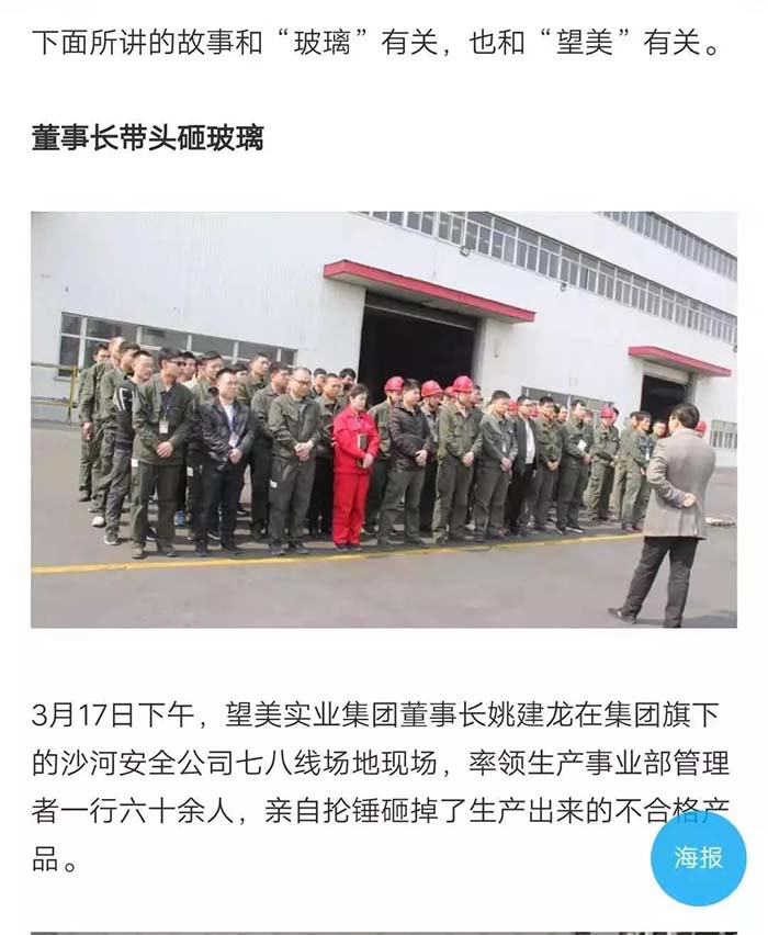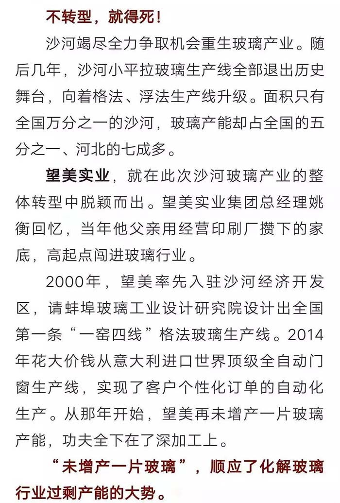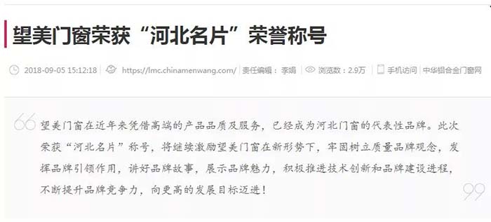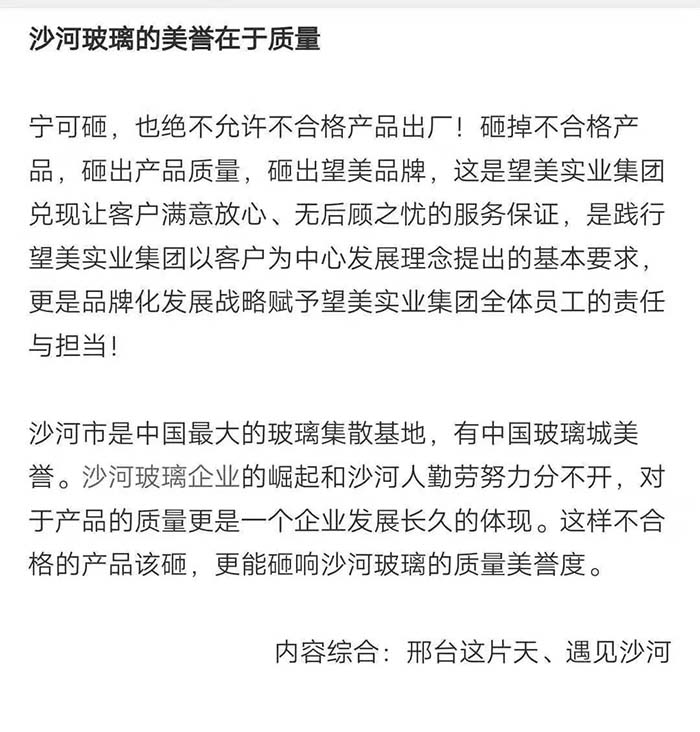 2019年,在河北日报的一期报刊中有这样一篇报道,名为“一片玻璃的‘蝶变’”,文中提到了望美集团在沙河玻璃产业转型中的典型事迹。 河北日报 望美的发展不仅在我们眼中,也在众人的客观评价里。那么,媒体眼中的望美你是否见过? 新玻网 这是新玻网对关于望美集团砸玻璃事件的报道。 望美集团坚持走高质量的品牌化发展战略,狠抓质量管理,致力为客户提供高品质的产品和高品位的服务。“以客户为中心,以奋斗者为本,以共赢促发展”,望美集团是认真的! 中华门窗网 2018年9月4日,由河北省发改委、省质监局、省工信厅、省住建厅、省农业厅、省旅发委、省国资委、河北日报报业集团、省品牌战略促进会共同主办第十二届河北品牌节在石家庄举行。 望美实业集团有限公司的“望美门窗”荣获2018年度“河北名片“荣誉称号。 牛城晚报 2019年4月18日,“我看邢”特色产业巡礼主题宣传活动在沙河启动。 来自新华社、中央广播电视总台、农民日报、河北日报、河北广播电视台等中央、省、市媒体记者及自媒体人于当日先后到望美集团旗下的望美实业、沙河安全公司进行实地采访。 媒体公众平台 咸宁日报、蓟州开发区党群服务中心、看沙河对望美捐款事迹的报道。 为支持新型冠状病毒感染肺炎疫情防控工作,望美集团旗下沙河安全、望美实业、天津中玻、中玻朝阳四家分公司积极伸出援手,向防御疫情需要的地区提供了资金或者物资的援助,总金额近150万元。 望美致力于打造紧跟社会发展步伐的、与时俱进的时代公司,经营精细化、运营智能化的现代化智慧公司,人人有爱心,讲文明、懂感恩、知敬畏、明事理、充满正能量的大爱公司。 在未来的发展之路上,望美集团将以更加崭新的姿态,更加奋发昂扬的干劲和精神,驰而不息地朝着时代公司、智慧公司、大爱公司坚实迈进,谱写新时代企业发展的新篇章!
