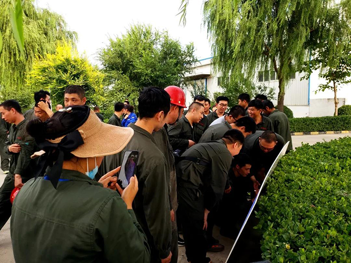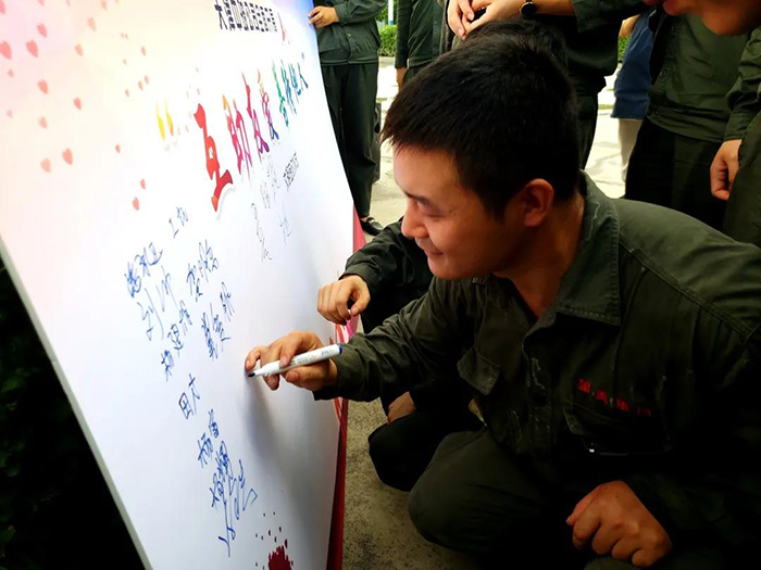 8月14日生产、后勤部门宣誓仪式上,员工在公司停车场处集合,在张林经理的带领下,一声“我宣誓”,全体员工举起右手。
