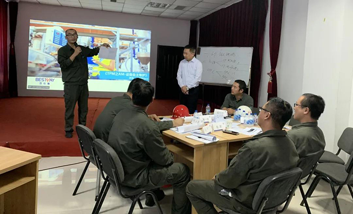 培训讲师采用PPT讲授、案例研讨、车间实习、小组讨论等多种授课方式,对TPM的定义、主要目标、推行TPM的必要条件、全员维修管理、点检、设备状态诊断及备件管理等方面进行了详细阐述。