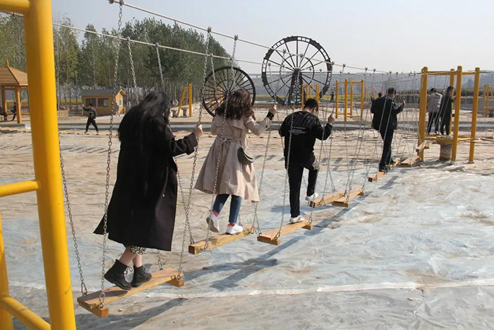 “稻草王国”“水车乐园”“树屋”等是小朋友、大朋友的最爱,在观赏风景中体会放松,在游玩项目中感受乐趣,尤其是各类的拓展挑战项目,让大家“乐不思蜀”。在“网红多人秋千”项目,大家站在秋千上,将秋千荡得很高,在挑战中感受团结的力量。