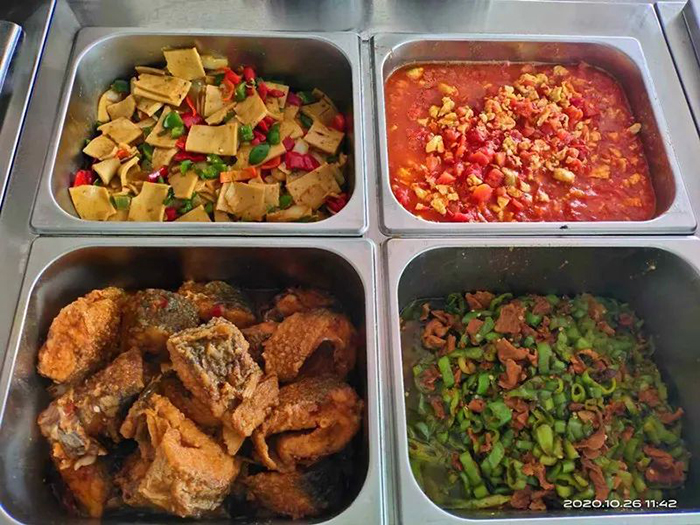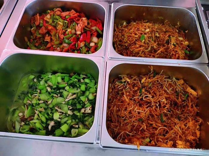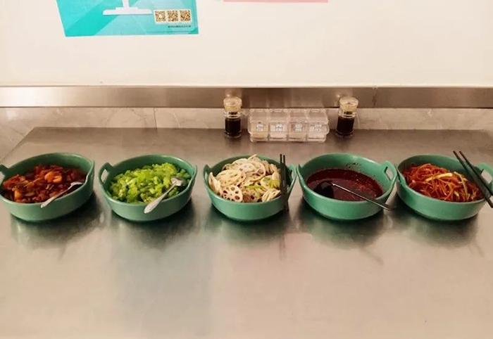 另外,食堂还充分考虑每个人饮食习惯差异及口味喜好不同,菜的盐味、辣味相对适中,同时早中晚提供多种口感丰富的凉菜、咸菜小吃。对于喜欢吃辣的朋友,食堂也精心准备了香辣油。