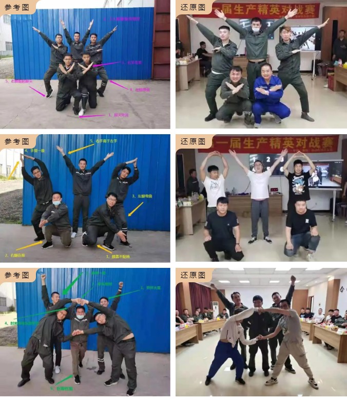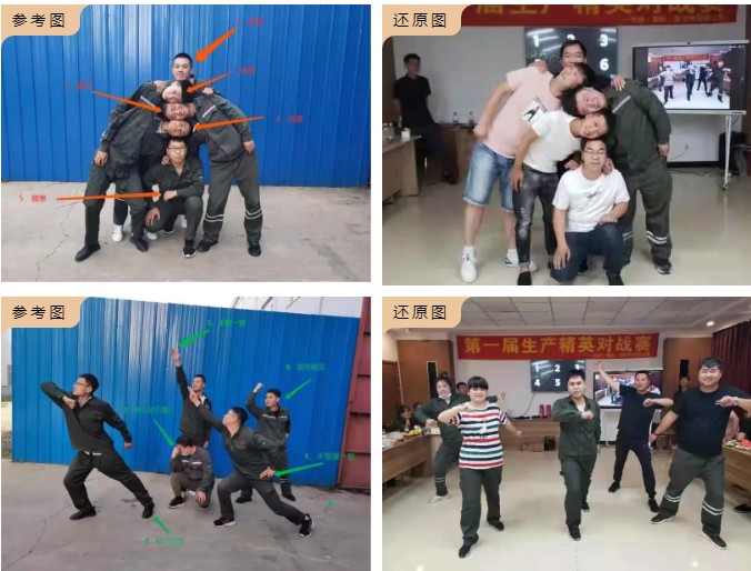 第一环节:众志成城。以抽签的形式决定出场顺序,队员先行离场,队长在一分钟内记住所抽取的照片的动作,然后队员入场指挥其进行还原。每个小组的队长可谓是用尽浑身解数,对每个人的动作分解、记忆、还原......