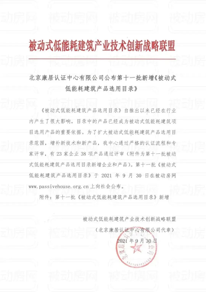 北京康居认证中心有限公司公布第十一批新增《被动式低能耗建筑产品选用目录》(以下简称《目录》)。