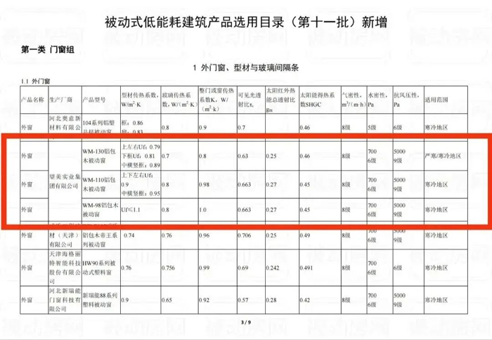 望美实业集团有限公司旗下的门窗产品WM-130铝包木被动窗、WM-110铝包木被动窗和WM-98铝包木被动窗入选门窗组外门窗目录。