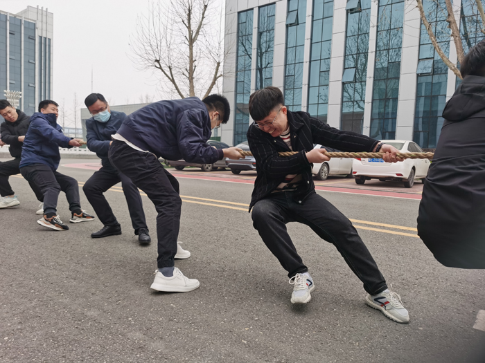 比赛现场十分激烈,部门管理者等场外人员呐喊助威,“身体下压,胳膊夹紧绳子”,大家一起呼喊“1,2,加油,1,2......”