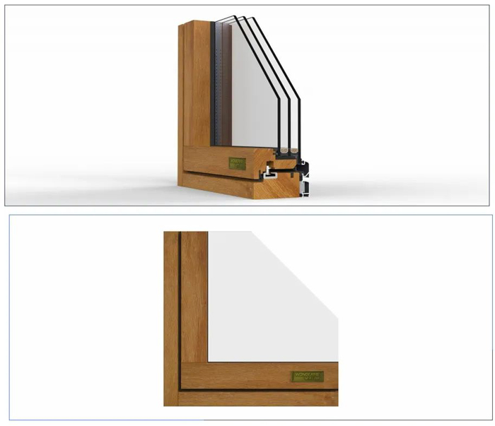 98框扇齐平铝包木门窗顾名思义,最大特点就是窗户的框与扇是齐平的;同时,中空玻璃直接安装在开启扇上,在窗户外观上,我们从外部只能看到玻璃,看不到开启扇,这就是98框扇齐平的隐扇设计效果。这两项的改变,使门窗外观更加简捷、美观,同时增强了产品的密闭性。