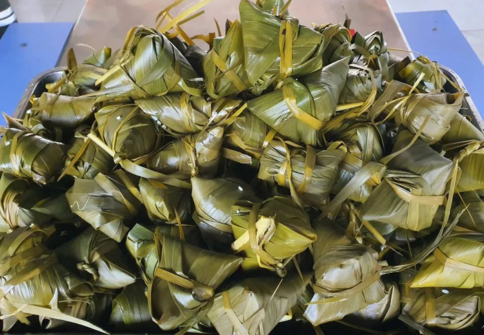 填装糯米、放入蜜枣、折叠粽叶、绑上线绳