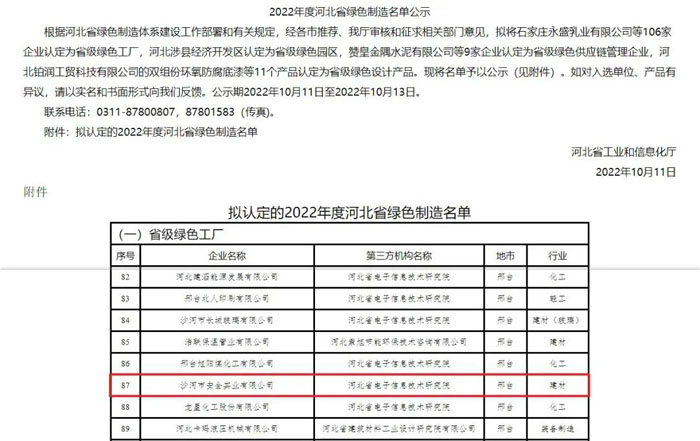 近日,河北省工业和信息化厅公示了2022年度河北绿色制造名单,其中,望美集团旗下沙河市安全实业有限公司获评省级“绿色工厂”称号。